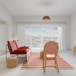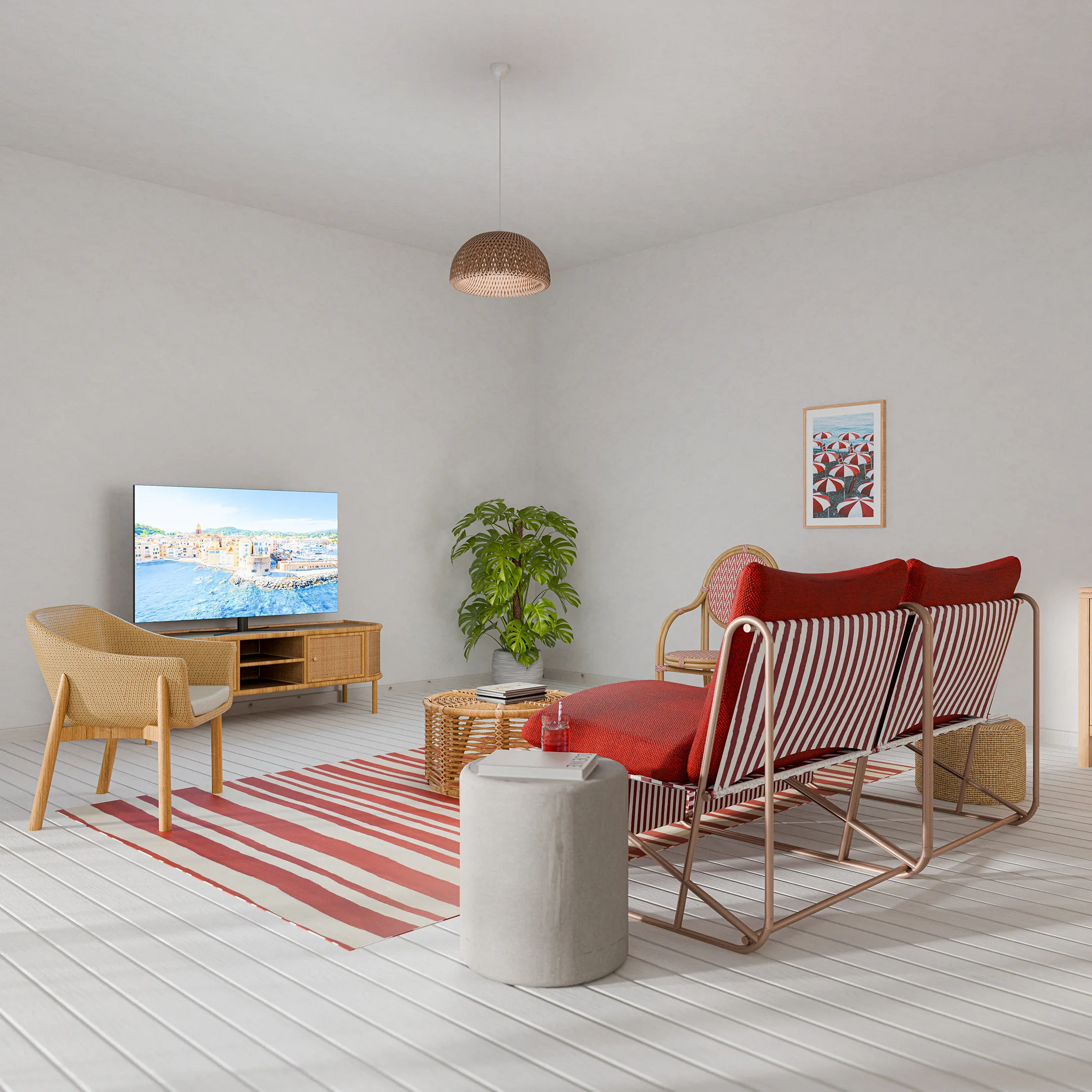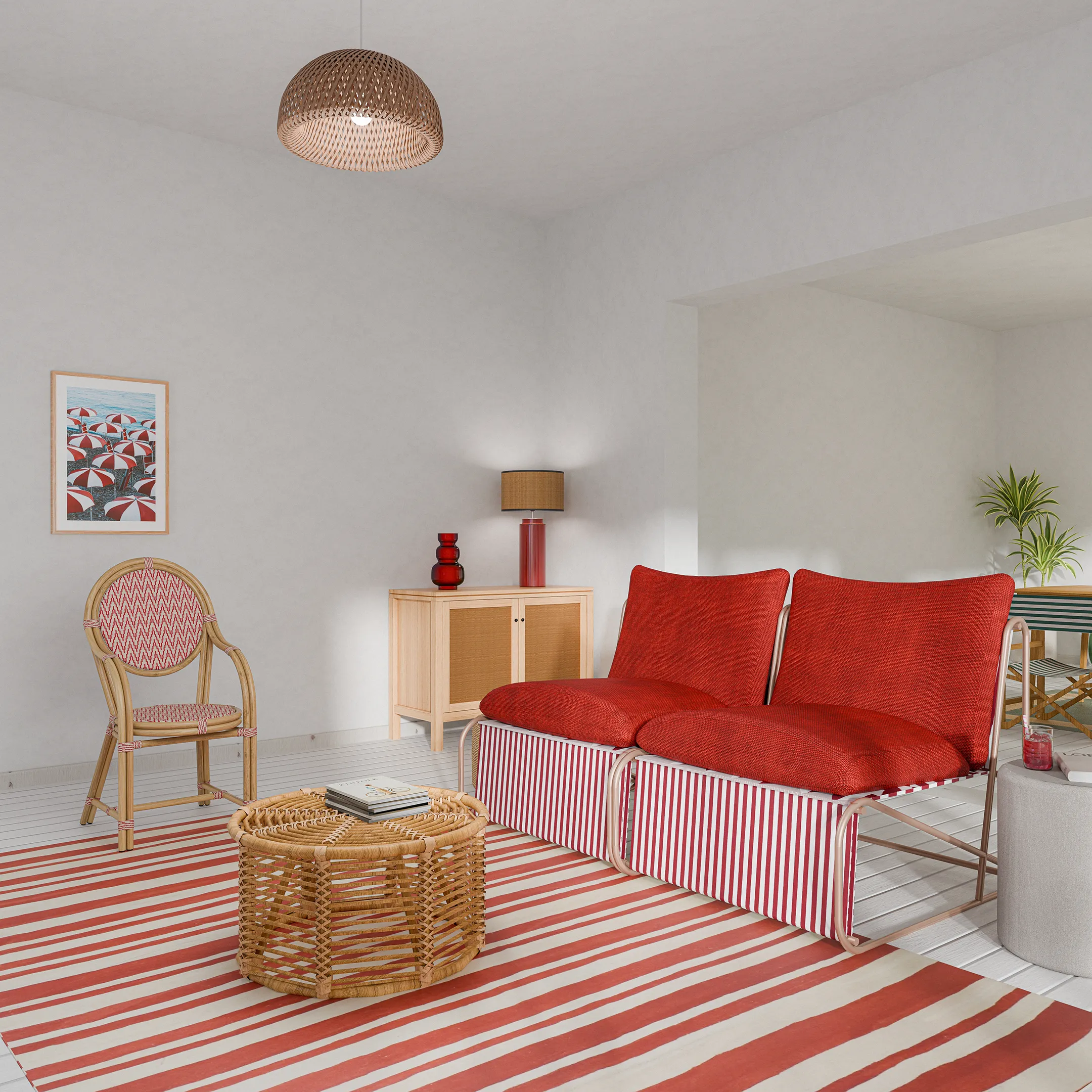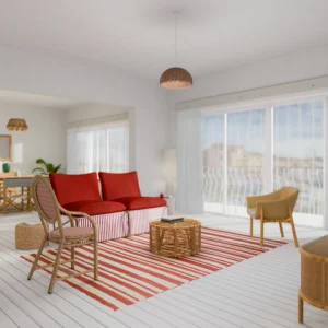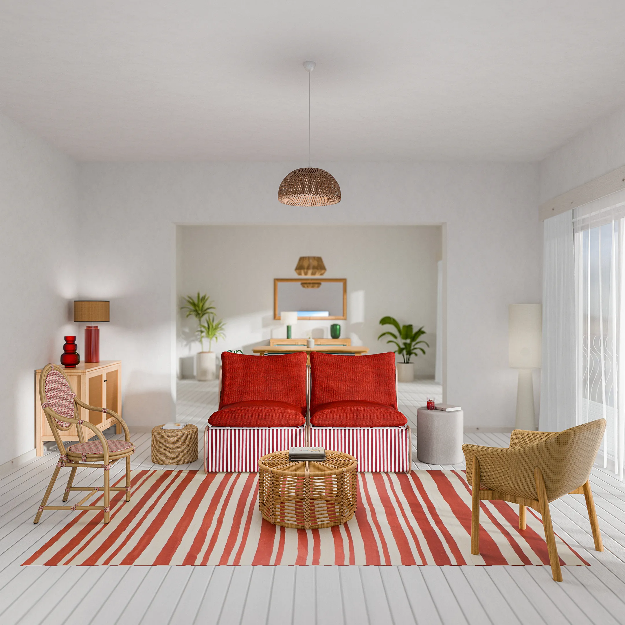 Linee morbide e materiali naturali definiscono un soggiorno conviviale e rilassato. Gli imbottiti in lino chiaro dialogano con il legno chiaro e le fibre intrecciate, mentre cuscini e tappeti a righe introducono profondità cromatica senza appesantire. La luce naturale valorizza ogni dettaglio, creando uno spazio accogliente e armonico, pensato per accogliere con disinvoltura e raffinatezza.