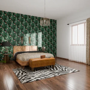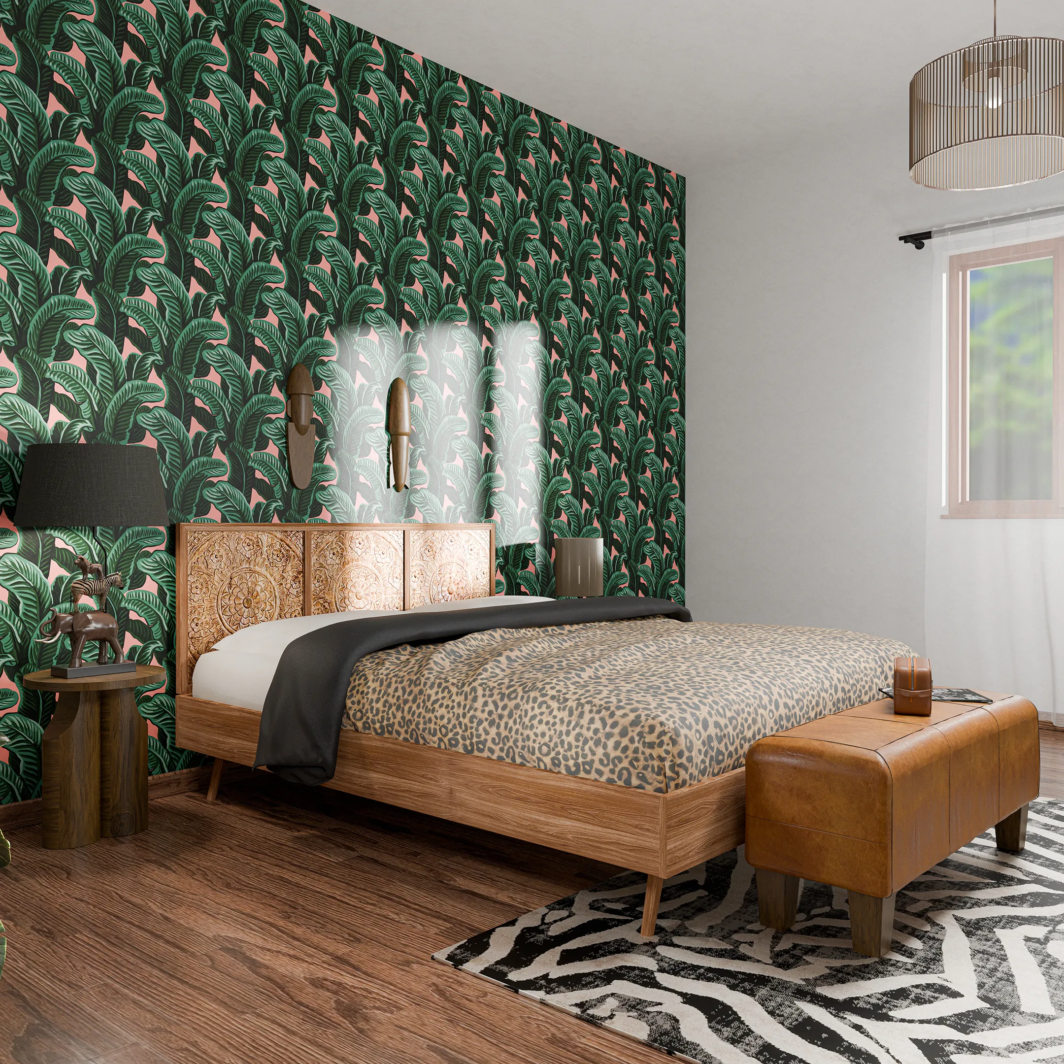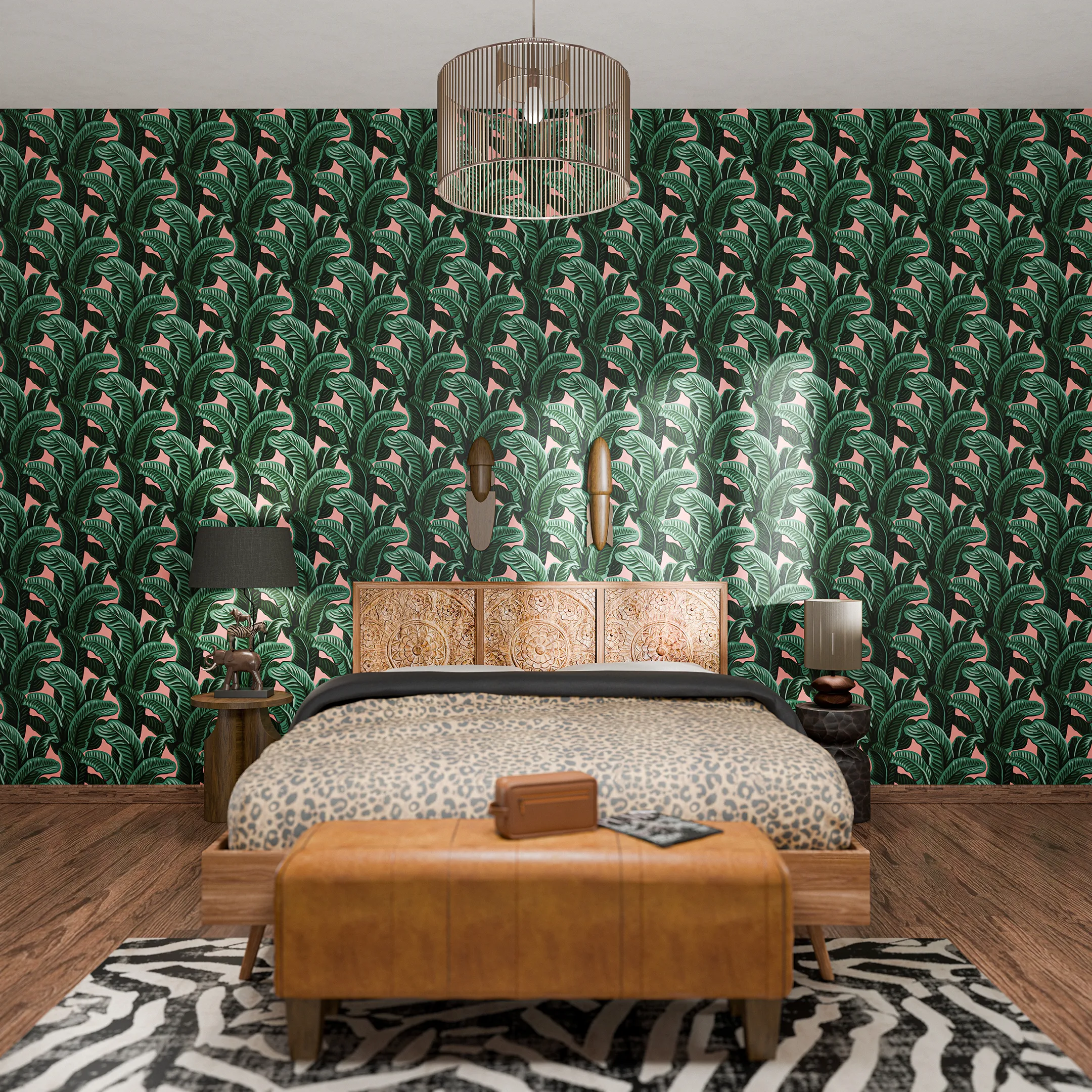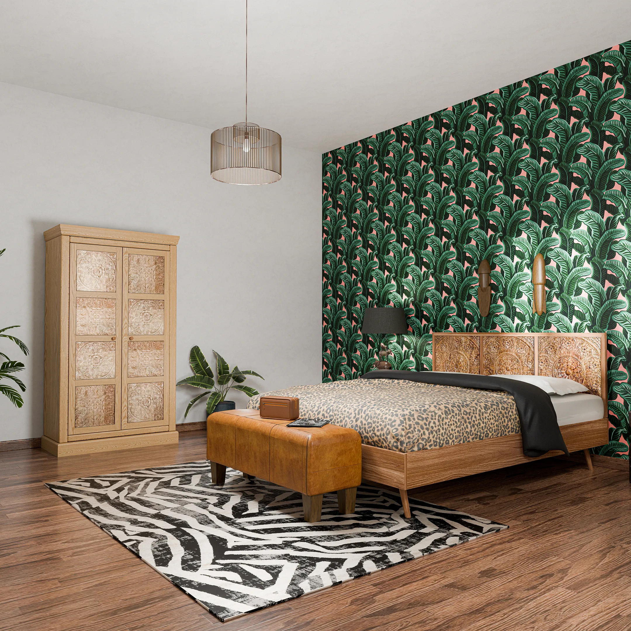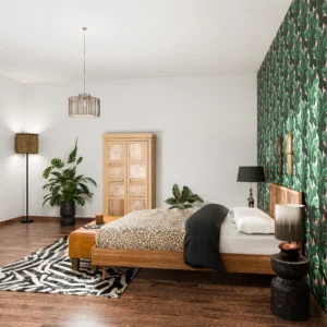 Uno spazio intimo e raccolto, definito da materiali caldi e superfici tattili. Il letto in legno è affiancato a una testiera intagliata e decorata da elementi naturali. Lampadari in fibre naturali, armadio in legno intagliato e una panca in cuoio caratterizzano l’ambiente. Le lampade e il tappeto richiamano al mondo animale e vegetale. L’atmosfera invita al rallentamento, offrendo comfort contemporaneo e una sensazione di equilibrio naturale.
