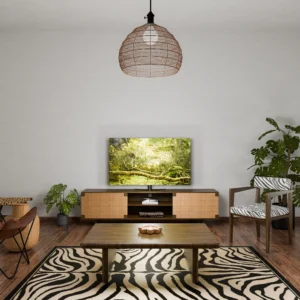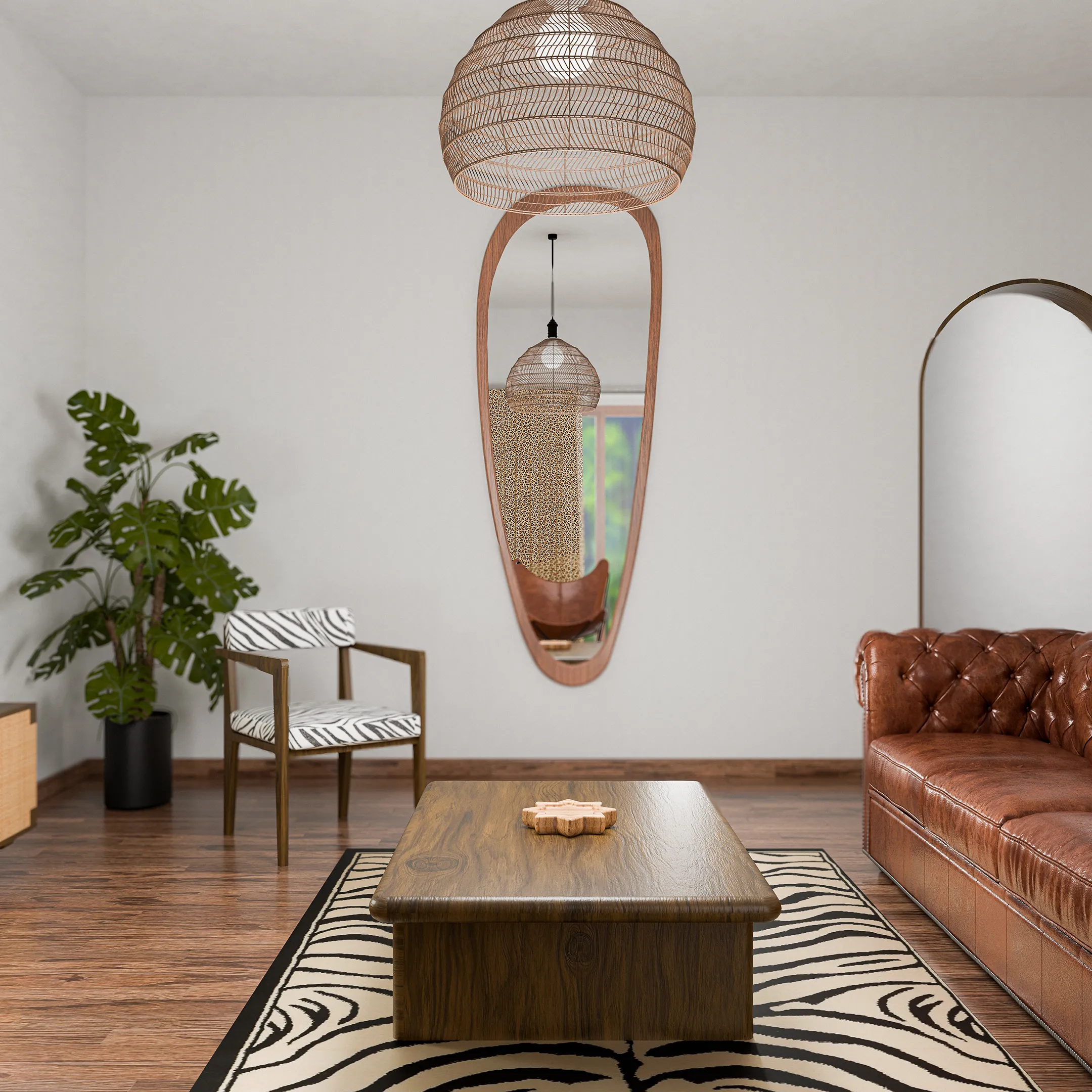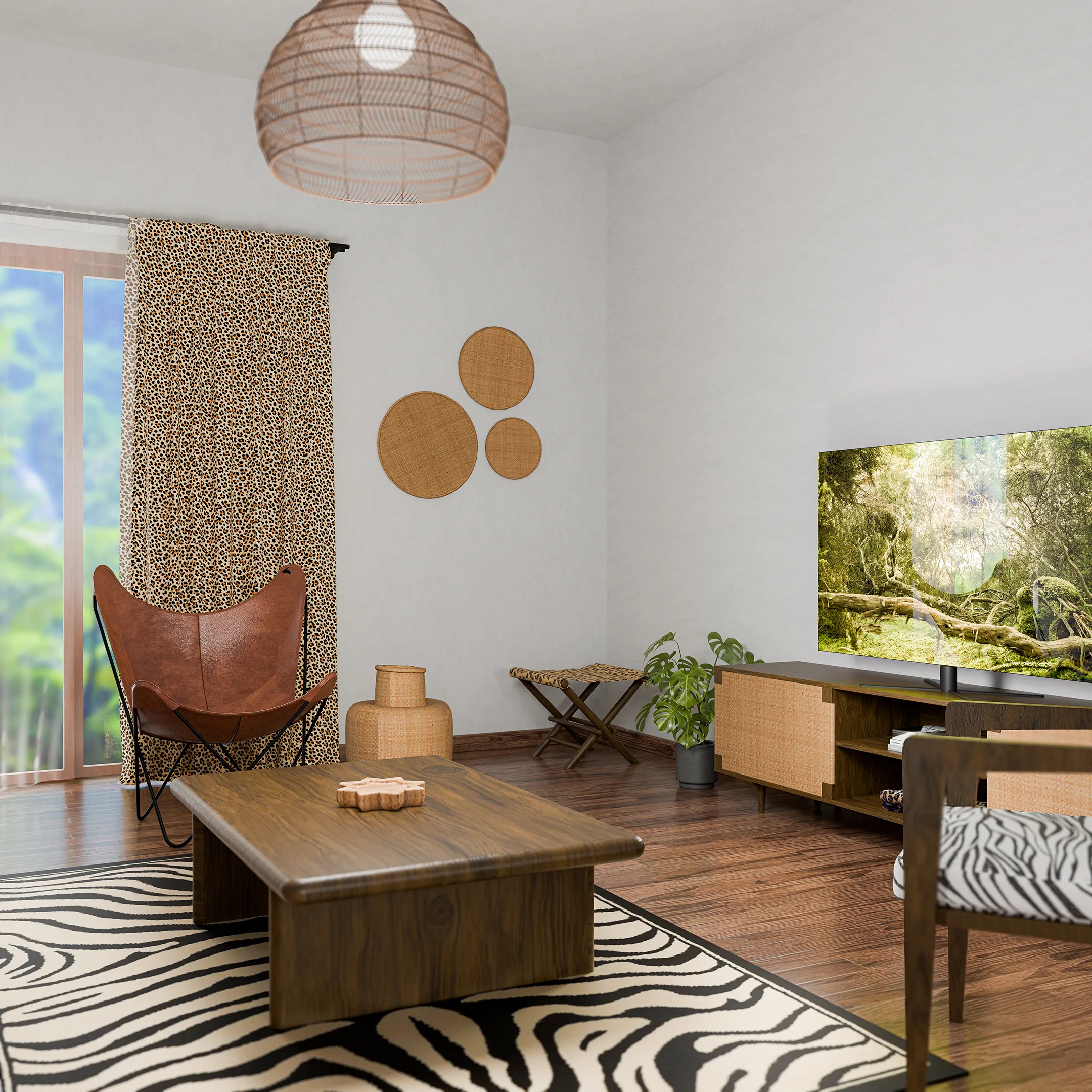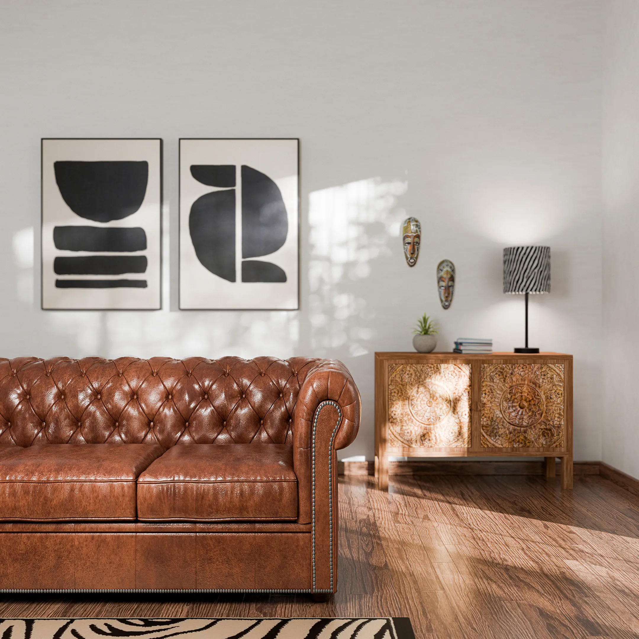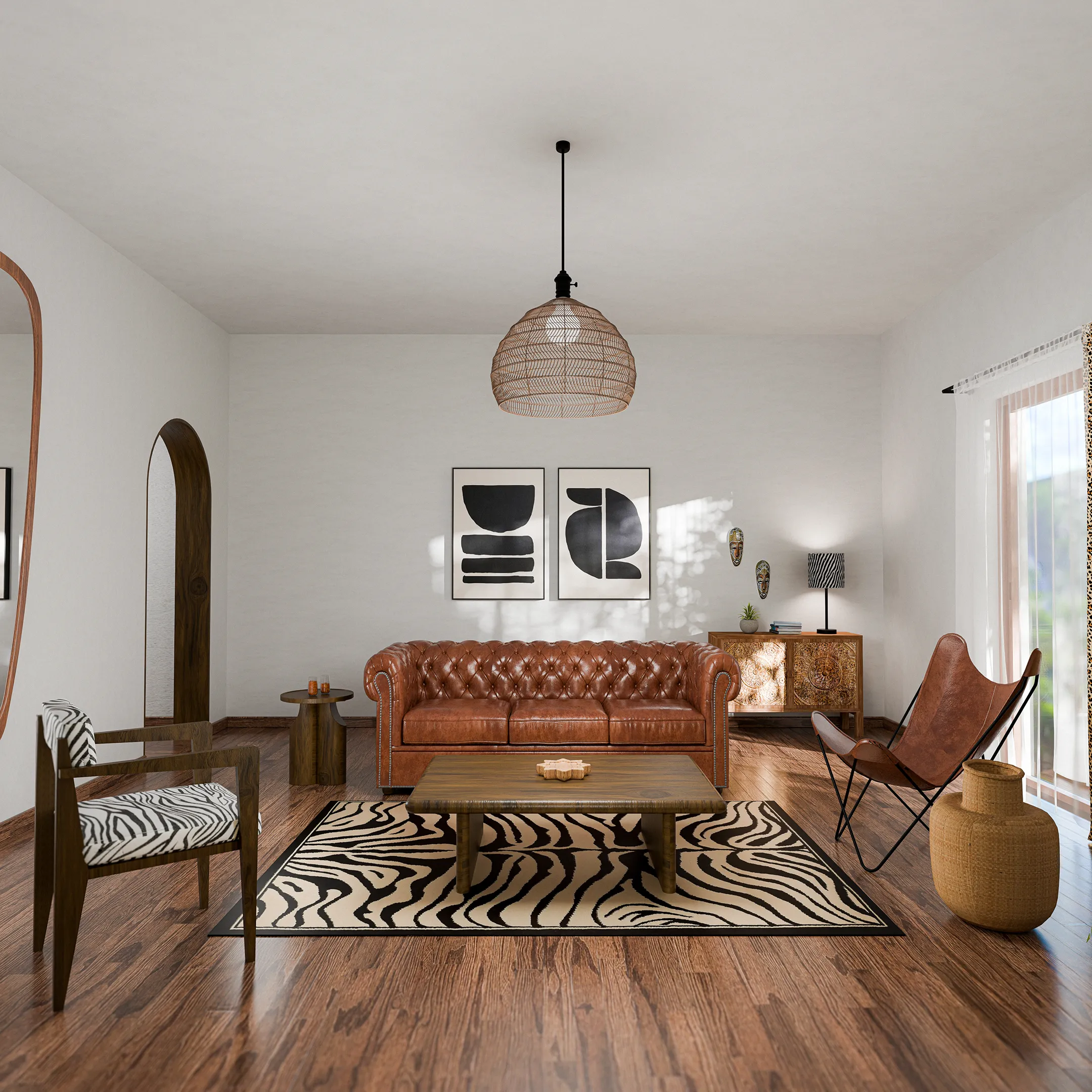 Un ambiente caldo, vivido e profondamente evocativo. Il divano, rivestito in cuoio naturale leggermente invecchiato, invita a rilassarsi. I tavolini in legno scuro e le maschere africane evocano un richiamo alla terra. A terra, un tappeto zebrato rafforza il legame con la natura. Le grandi piante tropicali aggiungono verticalità e colore, completando uno spazio che racconta un viaggio attraverso estetiche lontane, mantenendo però ordine e misura visiva.
