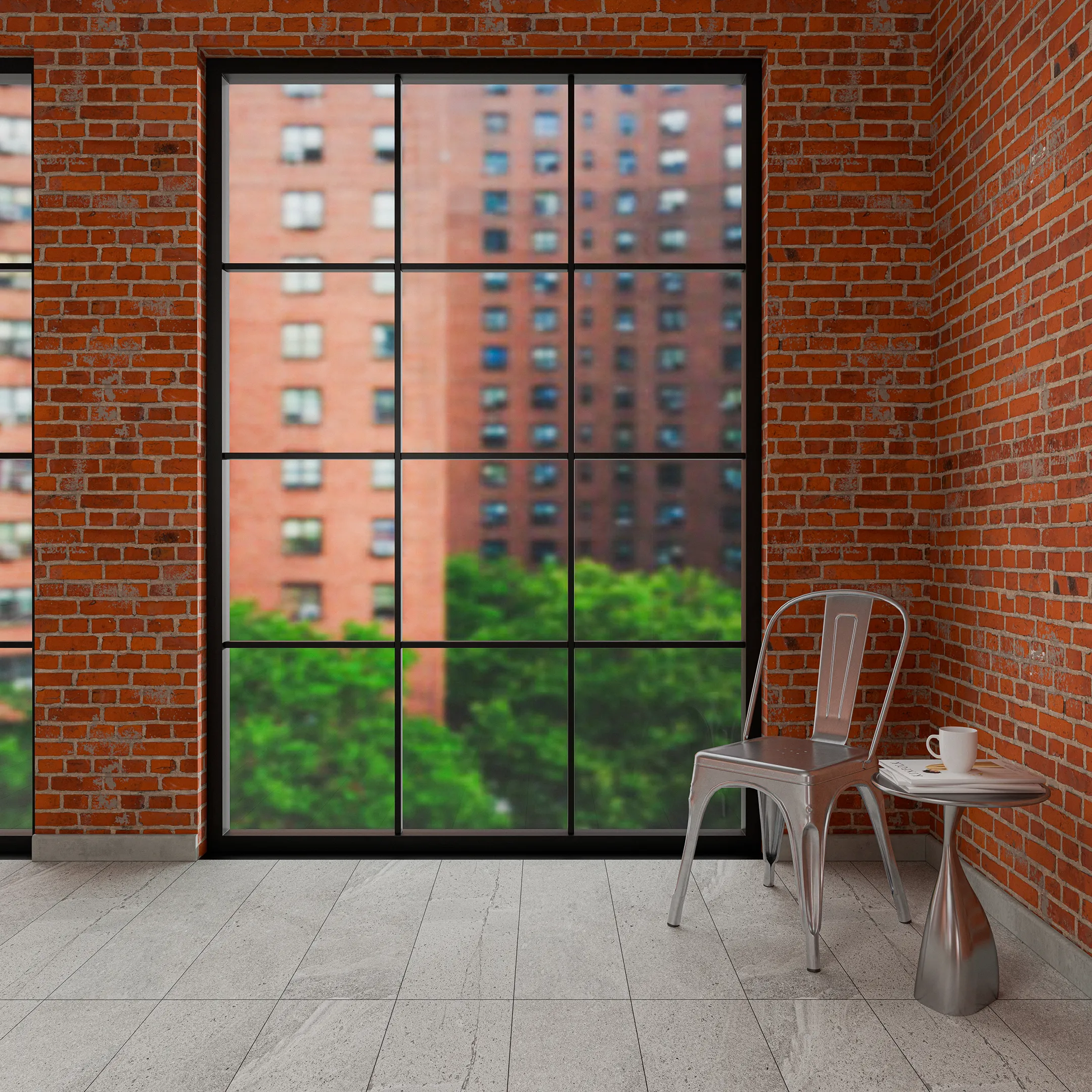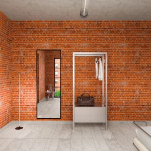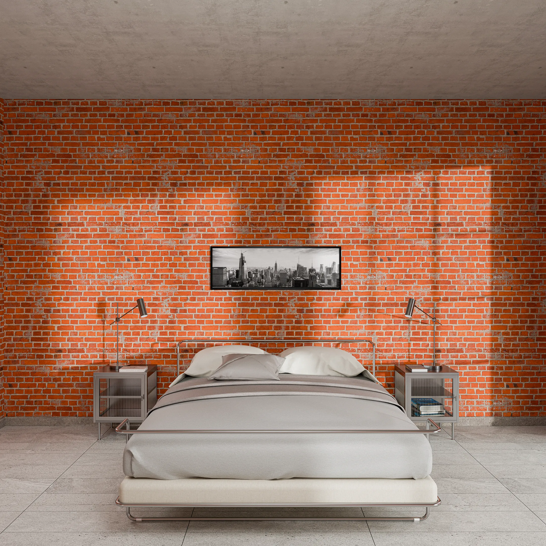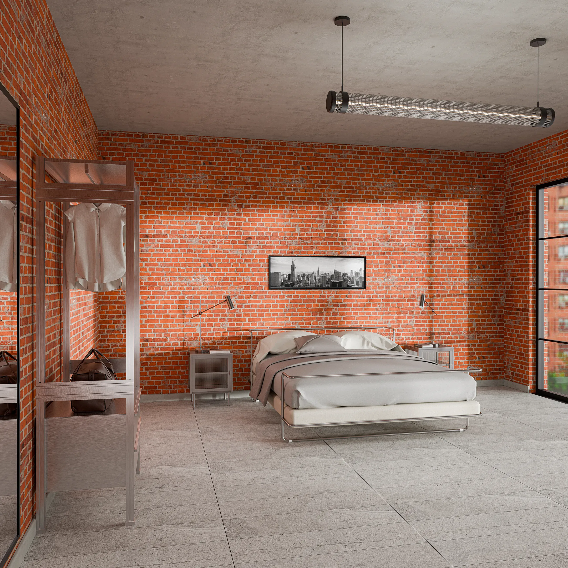 Linee nette, materiali puri e luce riflessa caratterizzano lo spazio. Il letto in acciaio e tessuto è affiancato da comodini in acciaio e vetro. I mattoni a vista aggiungono texture e carattere, mentre Il metallo utilizzato per l’armadio amplifica luminosità e percezione dello spazio. L’illuminazione tecnica in metallo cromato disegna l’atmosfera con precisione.