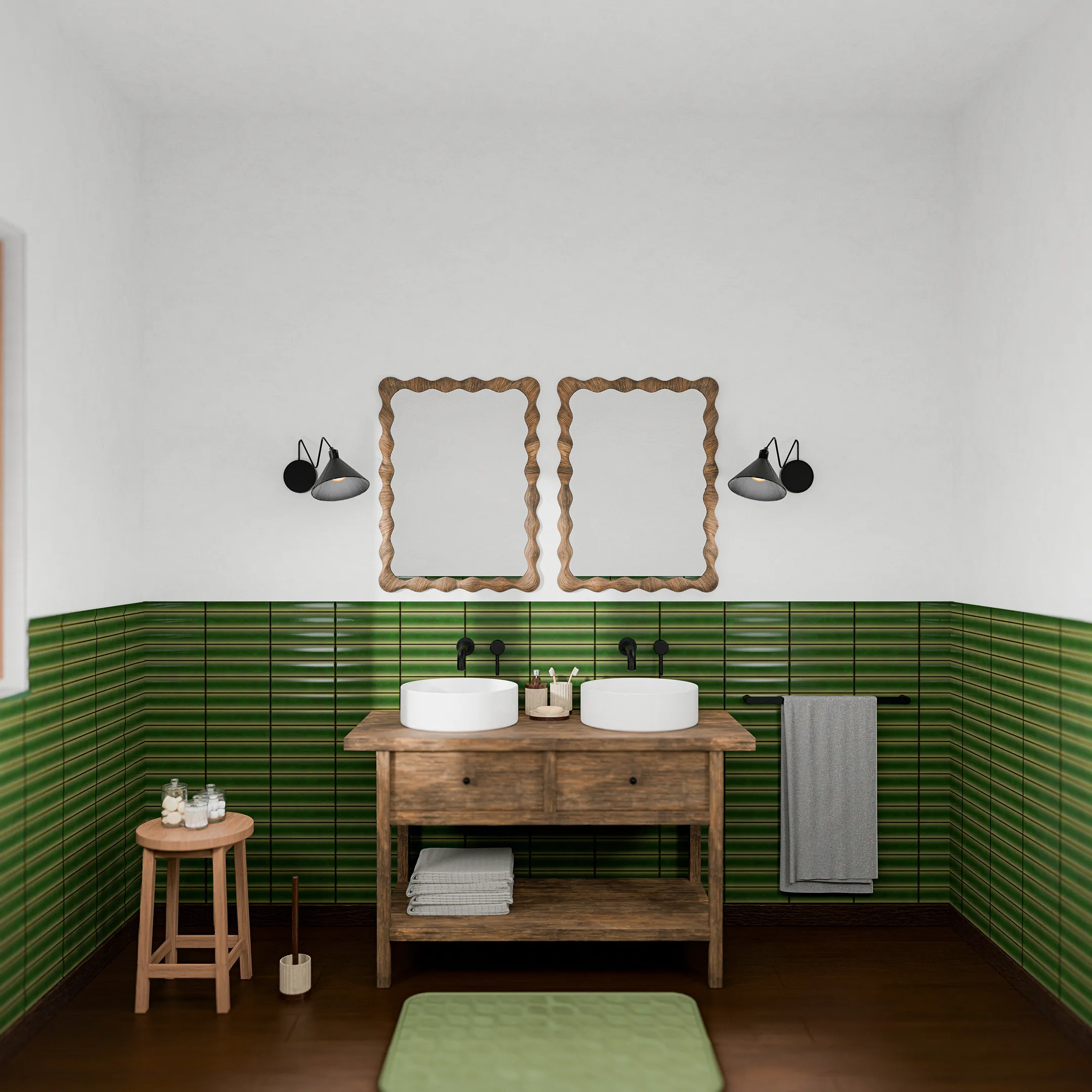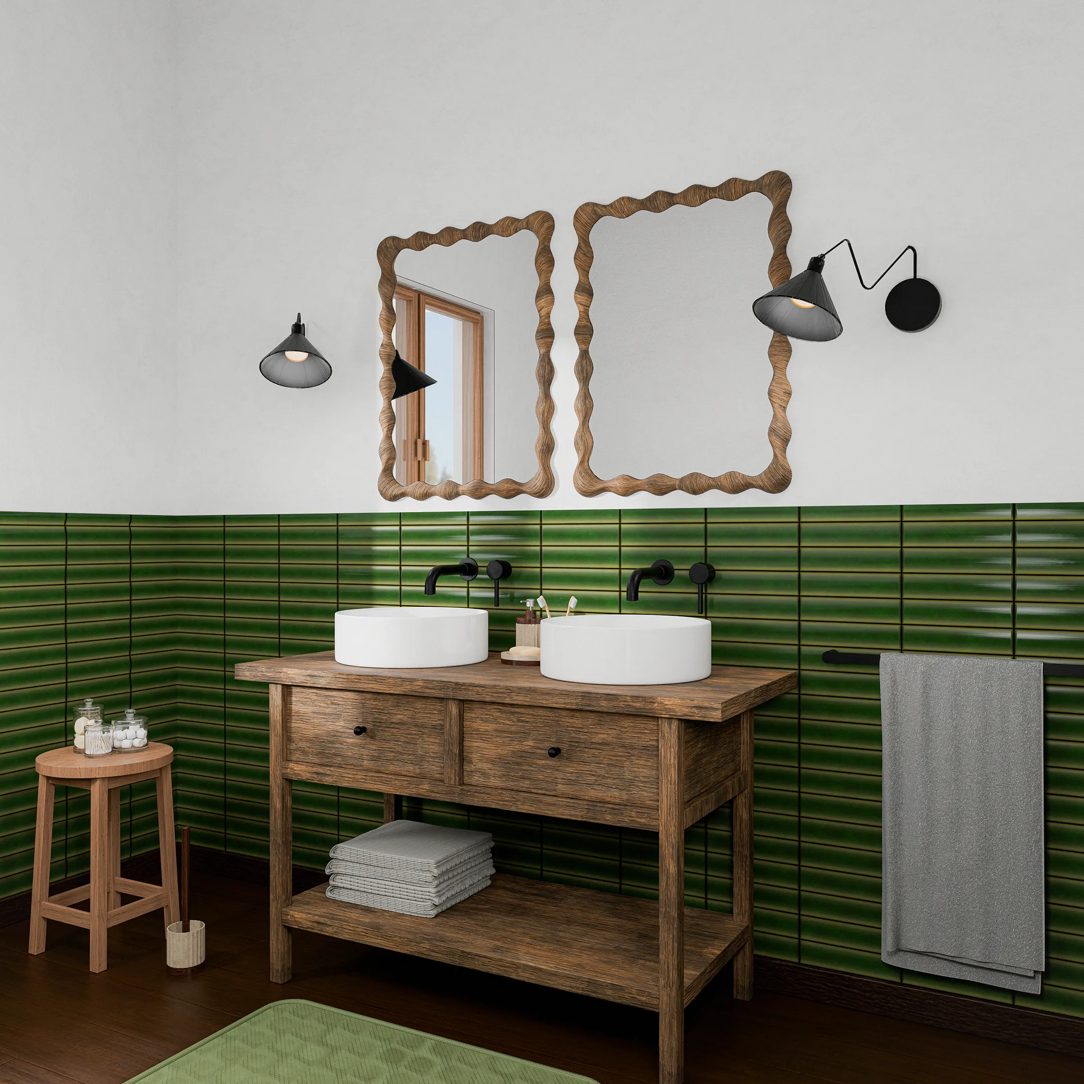 Un bagno che interpreta il lusso montano con equilibrio: lavabi e piani in legno e pareti dai richiami cromatici naturali. Elementi in ceramica e specchi definiscono volumi netti, mentre tessili naturali e illuminazione calda completano l’atmosfera, offrendo un’esperienza intima e avvolgente.